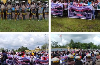 Masa demonstrasi damai di halaman gedung DPRD Mimika, Selasa (6/9/2022) meminta diterbitkannya surat penghentian penyidikkan kasus dugaan korupsi pembangunan gedung gereja Kingmi di jalan Agimuga Mile 32, Kabupaten Mimika, Papua Tengah, yang menjerat Bupati Mimika, Eltinus Omaleng.