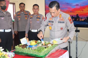 “Hari ini kita melaksanakan Syukuran dalam rangka Hari Lalu Lintas Bhayangkara ke 67, yang jatuh pada hari ini, tanggal 22 September 2022, walaupun Syukurannya kita laksanakan secara sederhana namun tidak mengurangi khidmatnya acara ini, pesan saya berilah Sopan santun beretika dalam menghadapi masyarakat .berdiri tegak lah di tengah panas dan hujan tak penting meminta untuk dipuja, ikhlas lakukan tugas sebagai ladang ibadah, tetap jalin sinergitas dengan instansi lainnya .lakukan komunikasi , koordinasi dan kolaborasi dan Selamat Hari Lalu lintas Bhayangkara ke 67 kegiatan ini tidak perlu kita lakukan dengan eforia cukup dengan kesederhanaan dan doa yang kita harapkan hanyalah ridho dari Allah, ungkapnya