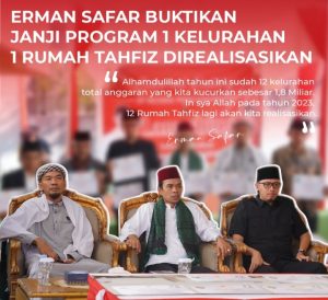 “Alhamdulillah tahun ini sudah 12 kelurahan, total anggaran yang kita kucurkan sebesar Rp 1,8 M. Ini wujud dari janji kampanye kami dulu. InsyaAllah tahun depan 12 rumah atau pondok tahfiz lagi di 12 kelurahan lain, sudah direncanakan pembentukannya,” ungkap Erman Safar.