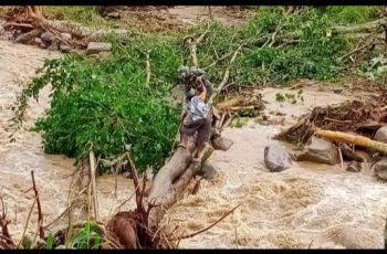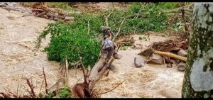 bersama rekan babinsa yang lain terjun langsung membantu warga yang akan menyeberangi melalui jalan alternatif berupa pohon tumbang dikarenakan jembatan yang menjadi jalan satu – satunya penghubung antar desa putus terbawa arus sungai yang bercampur material kayu dan batu.