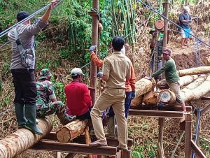 Babinsa Koramil 0825/05 warga bangun jembatan darurat penghubung Desa Karanganyar dengan Desa Kajarharjo Kec. Kalibaru Pasca Banjir