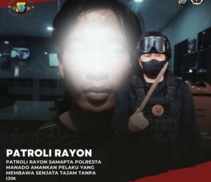 Patroli Rayon Samapta Polresta Manado mengamankan seorang laki-laki tersangka pelaku yang membawa senjata tajam tanpa izin, Minggu (13/11/2022) sekitar pukul 01.15 WITA.