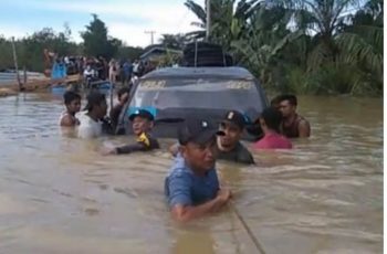 “Sopir tetap nekat menerobos genangan air mengakibatkan mobil terseret arus banjir kemudian membentur besi jembatan dan mengapung di badan jalan yang tergenang air dengan kedalaman lebih kurang 1,5 meter,” ujar Kapolsek.