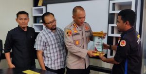 Plakat “Sahabat Pers” diserahkan langsung oleh Ketua DPP AWAI Dedi Saputra, S.H. didampingi Sekjen AWAI Andi Zuanda beserta beberapa anggotanya kepada Kapolres di ruang kerja Kapolres dengan disaksikan Kasatreskrim AKP Miftahuda Dizha Fezuono, S.I.K., Selasa (15/11/2022) siang.