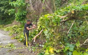 Briptu Rahmatullah mengatakan, dengan peralatan yang terbatas maka kami bergantian memotong ranting – ranting pohon tumbang yang menutupi sebagian badan jalan tersebut.