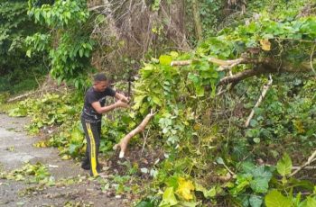 Briptu Rahmatullah mengatakan, dengan peralatan yang terbatas maka kami bergantian memotong ranting – ranting pohon tumbang yang menutupi sebagian badan jalan tersebut.