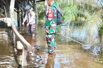 Bhabinkamtibmas Polsek Sanga Desa Polres Musi Banyuasin AIPDA Herman Andrayadi bersama Babinsa Koramil 401-02/Babat Toman berjibaku meninjau banjir Rabu (23/11/22).