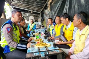 Kasat Lantas Polres Musi Banyuasin (Muba) AKP Ricky Mozam bersama personil satlantas lainnya berkeliling menyambangi beberapa komunitas ojek pengkolan yang berada di wilayah Kecamatan Sekayu, dengan tema Ngopi Bareng Pejuang Rupiah, Jumat 4 November 2022.