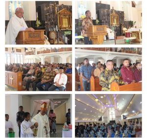 Acara itu di lanjutkan dengan misa Kudus yang di pimpin langsung oleh yang mulia Bapak Uskuptersebut Keuskupan Manokwari Sorong Mgr Hilarius Datus Lega PR, misa kudus itu juga di ikuti semua tamu undangan.