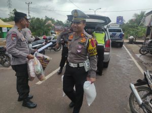 Peduli Korban Banjir di Bantaian, Satlantas Polres Rohil Bagikan Sembako.
