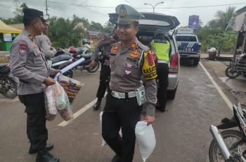 Peduli Korban Banjir di Bantaian, Satlantas Polres Rohil Bagikan Sembako.
