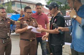 Selanjutnya massa yang tadinya bergerak aksi di tengah kondisi hujan itu kembali longmarch menuju kantor kejaksaan negeri Aceh Timur, di sana massa disambut Kepala Kejaksaan Negeri Aceh Timur, Semeru, SH, MH, beserta jajarannya.