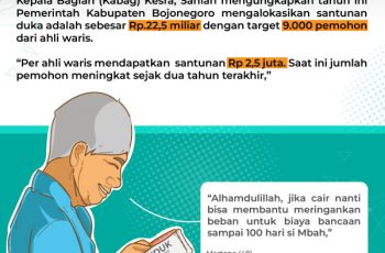 Kepala Bagian (Kabag) Kesra, Sahlan mengungkapkan tahun ini Pemerintah Kabupaten Bojonegoro mengalokasikan santunan duka adalah sebesar Rp.22,5 miliar dengan target 9.000 pemohon dari ahli waris.