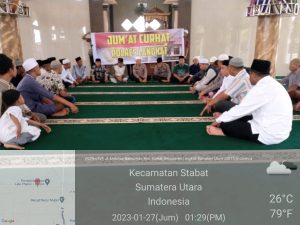 Kasi Humas Polres Langkat AKP Joko Sumpeno kembali menggelar Kegiatan “Jum’at Curhat” guna mendengarkan keluhan warga secara langsung MESJID JAMI’ AL AMIN Jalan Makmur Dusun III Desa Banyumas Kec. Stabat Kabupaten Langkat. Jum’at (27-01-2023).