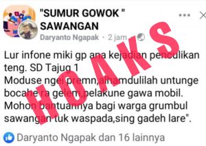 Informasi tentang upaya penculikan anak sekolah dasar (SD) di Desa Tajug, Kecamatan Karangmoncol, Kabupaten Purbalingga beredar di media sosial Facebook. Informasi tersebut diposting di grup Facebook Sumur Gowok Sawangan, Sabtu (28/1/2023) siang.