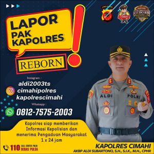 Dalam rangka implementasi Polri presisi Kapolres Cimahi AKBP Aldi Subartono, S.H., S.I.K., M.H., CPHR, meluncurkan layanan baru untuk mempercepat laporan warga kepada petugas kepolisian di wilayah hukum Polres Cimahi. Namanya “Lapor Pak Kapolres Reborn”. Melalui layanan ini, warga bisa melaporkan setiap kejadian maupun pengaduan kepada Kapolres Cimahi melalui Lapor Pak Kapolres Reborn nomor WhatsApp (WA) pribadi 081275752003.
