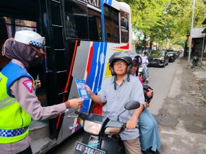 Sosialisasi dilakukan dengan membagikan leaflet tertib berlalu-lintas serta menggunakan pengeras suara.