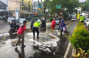 Proses pembersihan tumpahan solar dilakukan oleh tim dari PMK Kota Malang dengan menurunkan 2 unit mobil dan dibantu oleh anggota Satlantas Polresta Malang Kota.