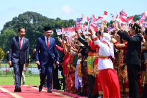 Presiden Joko Widodo menyambut kunjungan resmi Perdana Menteri (PM) Malaysia, Dato’ Seri Anwar bin Ibrahim, di Istana Kepresidenan Bogor, Jawa Barat, pada Senin, 9 Januari 2023. Kunjungan ini merupakan kunjungan resmi pertama PM Anwar Ibrahim sejak dilantik pada 24 November 2022 lalu.