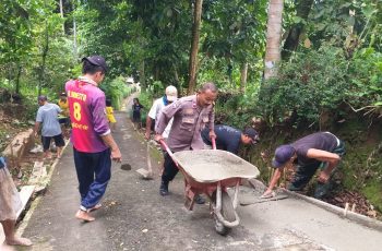 Bhabinkamtibmas Polsek Pengadegan Aiptu Hartoto mengikuti kerja bakti pelebaran dan pengecoran jalan di Desa Tetel, Kecamatan Pengadegan, Kabupaten Purbalingga, Minggu (12/2/2023). Kerja bakti dilaksanakan bersama warga RT 7 RW 4 desa setempat.
