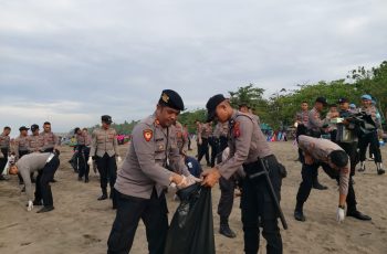 Polres Pangandaran kembali bersihkan sampah di pesisir Pantai Barat Pangandaran, Minggu pagi (5/2/2023).