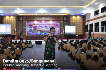 Dalam rangka membangun harmoni dalam kehidupan generasi muda Letkol Kav Eko Julianto Ramadan, M. Tr. (Han) Dandim 0825/Banyuwangi laksanakan wawasan kebangsaan tentang Kemah Moderasi Beragama kepada siswa-siswi Madrasah Aliyah Negeri 2 Genteng bertempat di jalan Wahid Hasim Dusun maron, Desa Genteng Kulon Kecamatan Genteng. (17-02-2023)