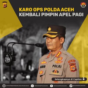 Karo Ops Polda Aceh Kombes Pol. Drs. Agus Sarjito kembali memimpin apel pagi di Lapangan Mapolda Aceh, Kamis (16/2/23).Sejumlah informasi disampaikan Karo Ops Polda Aceh, diantaranya mengajak seluruh personel jajaran Polda Aceh supaya bijaksana dalam menggunakan media sosial.