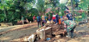 Lettu Inf M. Mokhlis Danramil 0825/11 Pesanggaran menyampaikan,” Babinsa melaksanakan pembersihan puing-puning rumah Bu Ginah dan pemasangan asbes rumah mbah Partiyem,”ucapnya