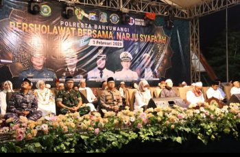 Ribuan orang mengikuti sholawat bersama yang digelar Polresta Banyuwangi, Jumat, 3 Februari 2023 malam. Selain sholawat bersama, juga dilengkapi dengan pemberian santunan pada 525 anak yatim dari seluruh Banyuwangi. Kegiatan ini diikuti jamaah dari luar kota Banyuwangi.