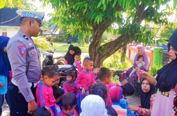 Dengan penuh senyum Aipda Donan juga sempat Memberikan Edukasi kepada Anak Usia Dini tentang tata tertib berlalu lintas, Pendidikan Berlalu Lintas, pengenalan umum rambu rambu lalulintas