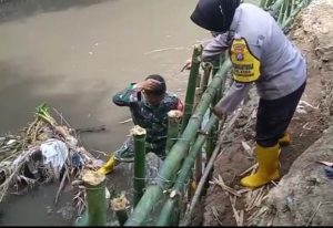 Serda Didik Budi Prasetyo Bersama Babinkamtibmas dan Warga Karya Bakti Benahi Tanggul Di Sungai Bagong Guna Penahan Banjir.