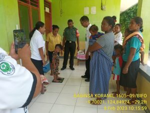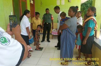 Anggota Babinsa Desa WeOe, Koramil 1605-09/Rinhat, Serda Henry Rumamelete melaksanakan pendampingan Bulan Penimbangan dan Pemberian Vitamin A kepada Balita bertempat di Dusun Webadaen, Desa WeOe, Rabu (08/02/2023).