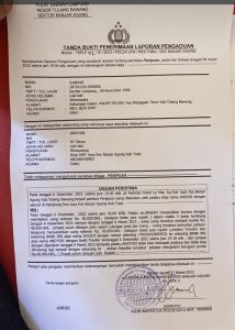 Berdasarakan tanda bukti penerimaan laporan pengaduan ( TBPLP ) Yang dikeluarkan Polsek Banjar Agung Polres Tulang Bawang bernomor : TBPLP / /III/2023/Polda Lampung /Res Tuba /Sek Banjar Agung, pelapor atasnama JN Warga Kampung Kahuripan Dalam Kecamatan Menggala Timur, Sedangkan terlapor AS warga kampung Dwt Jaya Kecamatan Banjar Agung Kabupaten Tulang Bawang Lampung, yang juga disinyalir menjadi salah satu ketua lembaga di Tulang bawang Lampung