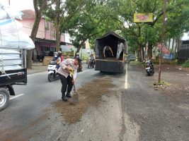 Polsek Kalimanah Bersama Warga Bersihkan Tumpahan Minyak Goreng di Jalan