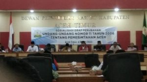 Bupati Aceh Timur Ir. Mahyuddin, M.Si menghadiri Sosialisasi Draf Perubahan Undang-undang Nomor 11 Tahun 2006 Tentang Pemerintahan Aceh.Kegiatan Sosialisasi yang diprakarsai Dewan Perwakilan Rakyat Aceh (DPRA), menyosialisasikan draf perubahan UU nomor 11 Tahun 2011 tentang Pemerintah Aceh pada Zona I Dewan Perwakilan Rakyat Kabupaten (DPRK) Aceh Timur.