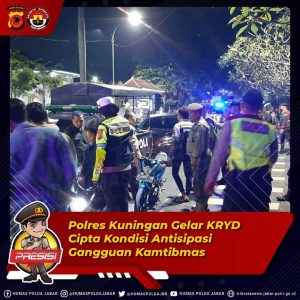 “Kapolres Kuningan, AKBP Dhany Aryanda mengatakan Patroli Gabungan Kegiatan Rutin Yang di Tingkatkan (KRYD) dalam rangka Cipta Kondisi Keamanan dan Ketertiban Masyarakat di Wilayah Hukum Polres Kuningan, Melaksanakan Patroli Antisipasi C3 (Curat, Curas, Curanmor) serta Antisipasi Terjadinya Balap Liar dan Geng Motor di Wilayah Hukum Polres Kuningan Polda Jabar,” Kata Kapolres, AKBP Dhany Aryanda.