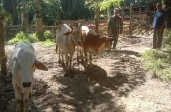 Dalam rangka pencegahan Penyakit Mulut dan Kuku (PMK) kembali anggota Koramil 0321-05/RM, Serda Ade. R melaksanakan Kegiatan Pegecekan PMK pada hewan ternak sapi milik Amir warga di