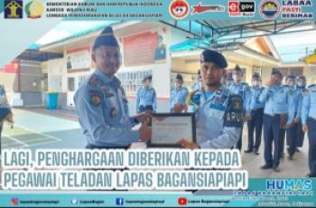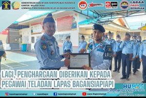 Kepala Lapas Kelas IIA Bagansiapiapi Wachid Wibowo secara langsung menyerahkan penghargaan kepada pegawai teladan Lapas Bagansiapiapi Triwulan I yang diberikan kepada Rudi Syahputra yang saat ini merupakan Komandan Jaga Regu IV