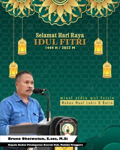 Kepala Badan Pendapatan Daerah Kab. Maluku Tenggara Bruno Ohoiwutun. S.sos, M.Si Mengucapkan SELAMAT HARI RAYA IDUL FITRI 1 Syawal 1444 H/2023 M, MINAL AIDIN WAL FAIDZIN MOHON MAAF LAHIR DAN BATHIN.