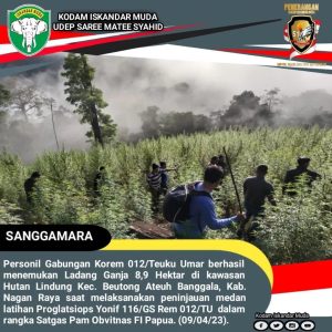 Tim Gabungan Korem 012/TU, Binda Aceh, BAIS TNI, Deninteldam IM, Tim Intelrem 012/TU, Unit Inteldim 0116/NARA, Penrem 012/TU dan Yonif 116/GS berhasil menemukan Ladang Ganja ± 8,9 Ha di kawasan Hutan Lindung Kec. Beutong Ateuh Banggala, Kab. Nagan Raya saat melaksanakan peninjauan medan latihan Proglatsiops Yonif 116/GS Rem 012/TU dalam rangka Satgas Pam Obvitnas FI Papua. (09/04/23).