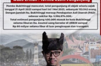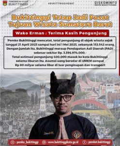 Pemko Bukittinggi mencatat, total pengunjung di objek wisata sejak tanggal 21 April 2023 sampai hari ini 1 Mei 2023.