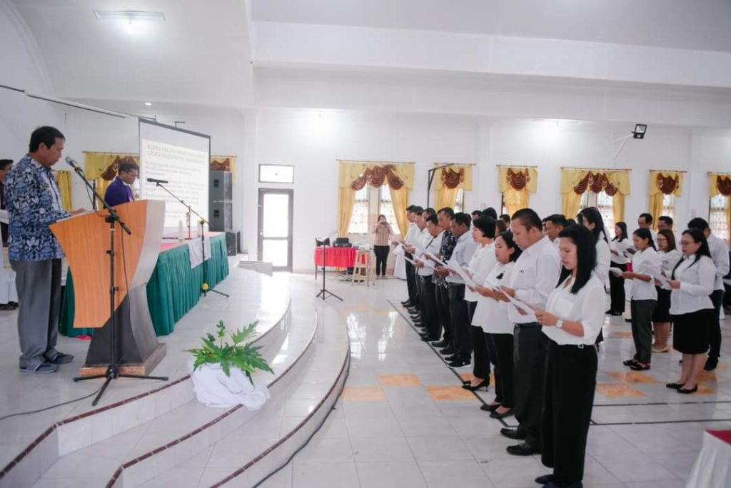 Bupati Humbang Hasundutan Dosmar Banjarnahor, SE yang diwakili Asisten Administrasi Umum Drs. Janter Sinaga Lantik Pengurus Lembaga Pembinaan dan Pengembangan Pesparani Katolik Daerah (LP3KD) Periode 2022 sampai dengan 2027 bertemat di Pendopo Kantor Bupati Kabupaten Humbang Hasundutan,Sabtu,4/3/2023.