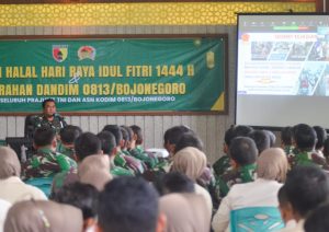 “Atas nama pribadi dan Satuan, kami mengucapkan selamat Hari Raya Idul Fitri 1444 Hijriah, Minal ‘aaidiin wal faaiziin mohon maaf lahir dan batin. Tetap semangat, tingkatkan soliditas antar anggota dan berbuat yang terbaik demi kemajuan Satuan, bangsa dan negara yang kita cintai,” kata Dandim 0813 Bojonegoro Letkol Arm Arif Yudo Purwanto, dalam sambutannya.