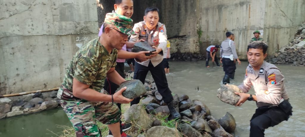 Nampak, anggota Polri dan TNI itu bahu membahu bersama warga, membersihkan sampah dan mengeruk lumpur di dasar sungai.