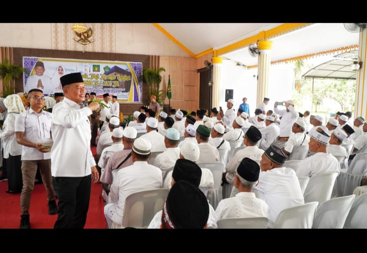 Plt Bupati Langkat H.Syah Afandin SH melalui Sekdakab Langkat H. Amril, S.Sos, M.AP menghadiri manasik sekaligus tepung tawar calon jamaah haji (CJH) Kabupaten Langkat 1444 H/2023 M, di Jentera Malay Rumah Dinas Bupati Langkat, Rabu 24 Mei 2023.