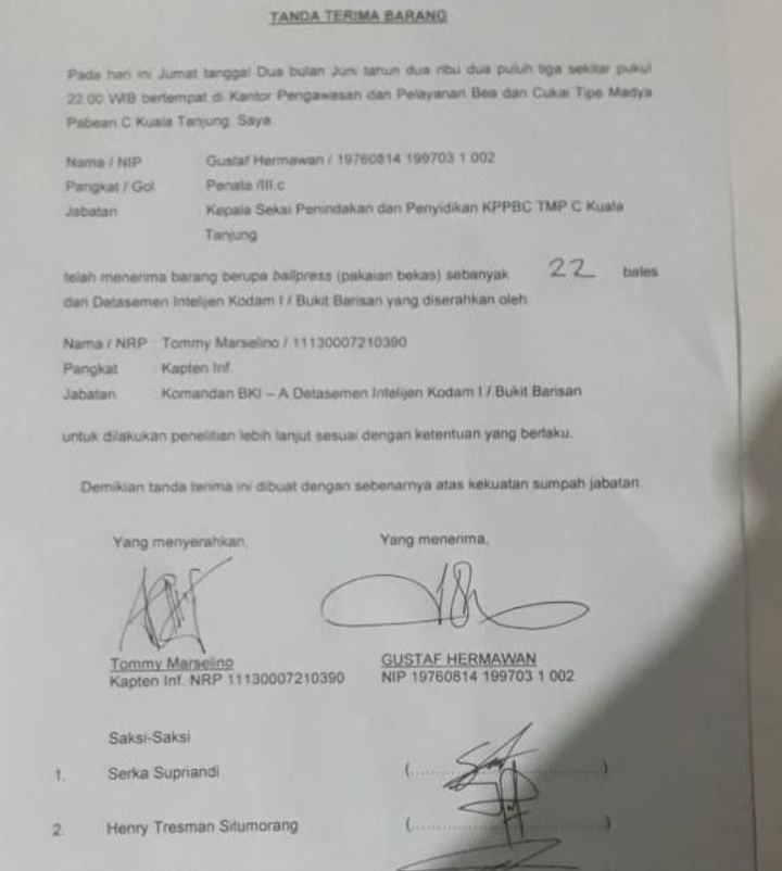 Kapendam I/BB Kolonel Inf Rico Julyanto Siagian, S.Sos, menyebutkan bahwa keberhasilan tim gabungan berawal pada hari Kamis 01 Juni 2023 pukul 23.40 Wib, Tim Gabungan Monitoring Deninteldam I/BB dan Bea Cukai Kab. Batu bara mendapat laporan dari masyarakat bahwa adanya barang selundupan yang diduga berupa Ball Pres Baju Bekas yang di muat oleh mobil Indah Logistic cargo Nopol B 9832 FXU, di Jalinsum Sumatera tepatnya di RM. Binaria Kec. Lima Puluh Kab. Batu Bara.