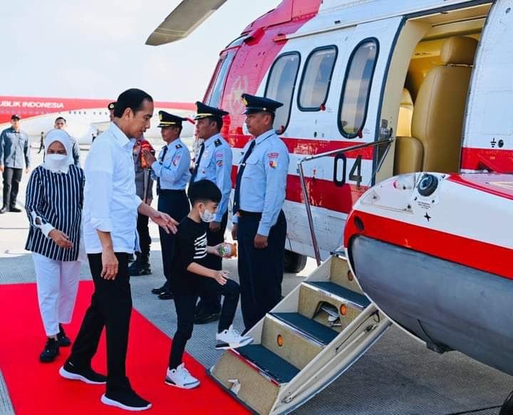 Dari Bandar Udara Internasional Zainuddin Abdul Madjid, Kabupaten Lombok Tengah, Presiden Joko Widodo dan Ibu Iriana bersama rombongan melanjutkan perjalanan menuju Kabupaten Sumbawa Barat dengan menggunakan Helikopter Super Puma TNI AU pada Selasa, 20 Juni 2023 pukul 9.35 WITA.( El Roy)