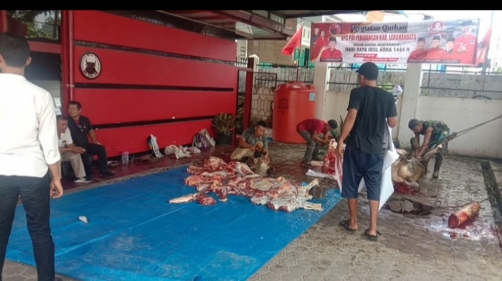 Ketua DPC PDI Perjuangan Kapupaten Labuhan batu, Dahlan Bukhori Sekretaris Nardus Naibaho, Bendahara Maramunthe beserta jajaran partai, menyalurkan dan membagikan daging hewan kurban kepada Kader, anggota, simpatisan dan masyarakat disekitar dalam rangka Idul adha 1444 H, Jum’at, 30/06/2023 Di halaman kantor sekretariat DPC PDI Perjuangan Kabupaten Labuhan batu.