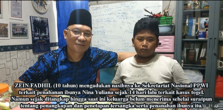 Yth. Para Polisi berhati baik dimanapun berada, malam ini (Rabu, 31 Mei 2023, pukul 22.00 wib) saya didatangi seorang anak usia 10 tahun, bernama Zein Fadhil, mengadukan nasibnya. Permasalahannya: Ibunya bernama Nina Yuliana, saat ini ditahan di Polsek Tanjung Duren, dengan sangkaan kasus togel, sudah 14 hari. Hingga saat ini keadaan dan kondisi ibunya itu belum diketahui. Belum ada sehelai surat apapun dari Polsek kepada keluarga sejak Ibu Nina Yuliana ditangkap, hingga saat ini.