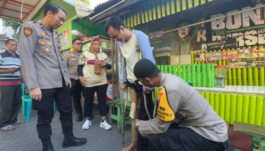 Rudiono Arifin (42) warga Tambak Madu, Kelurahan Tambakrejo seorang penjual kopi akhirnya mendapatkan bantuan kaki palsu dari Polrestabes Surabaya melalui Polsek Simokerto berkat program baru yakni Polisi RW.